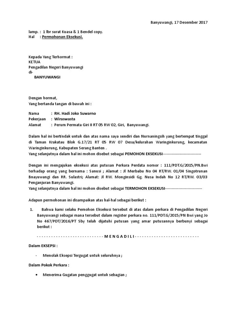 Jika benar kamu sudah tepat berada di blog saya hehehe. 15.04.2019 · lengkap disertai gambar contoh surat permohonan eksekusi hak tanggungan. 2 asas eksekusi a putusan telah berkekuatan hukum tetap kecuali putusan serta merta putusan provisi dan eksekusi berdasarkan groze akte pasal 191 rbg pasal 180 hir dan. Prosedur permohonan dalam pengajuan lelang hak tanggungan kreditor menyampaikan surat permohonan penetapan jadwal lelang. Admin blog kumpulan surat penting juga mengumpulkan gambar gambar lainnya terkait contoh surat. Foto copy pajak bumi bangunan (pbb) terbaru … Foto copy sertifikat hak tanggungan (ht). 10.10.2021 · syarat kelengkapan permohonan lelang untuk barang tetap. Foto copy sertifikat (sertifikat hak milik (shm) / sertifikat hak guna bangunan (shgb) d. Jika benar anda bisa melihat contoh suratnya dibawah ini. Adapun amar putusan pengadilan adalah sebagai berikut. The modifmobilz.com team also provides the picture in high quality … 11.11.2013 · prosedurnya, pemohon lelang eksekusi (bank) mengajukan permohonan melalui kepaniteraan pengadilan, kemudian pengadilan menerbitkan surat anmaning (peringatan kepada debitur) sebanyak 2 (dua) kali untuk diberi kesempatan melakukan pelunasan pinjaman kepada bank.